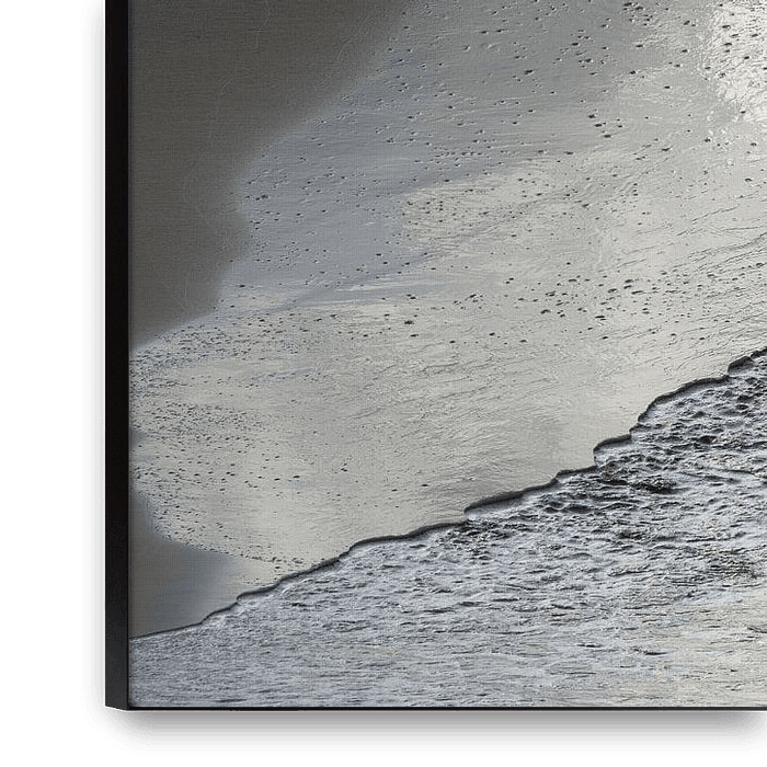 Zilvergrijze reflecties op het zandstrand en subtiele golven aan de Middellandse Zeekust in Spanje. Deze symmetrische compositie is gewijd aan de kalme atmosfeer van de zee en het meditatieve effect van het stromende water.
