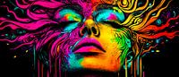 Deze foto toont het gezicht van een vrouw met gesloten ogen alsof ze in een diepe droom is. Haar huid en lippen gloeien in felle neonkleuren, variërend van levendig roze tot glinsterend blauw en helder geel. De kleuren stromen door en rond haar gezicht als golven of energie, alsof ze verbonden is met een andere wereld of een spirituele…