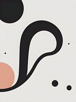 Een geraffineerde minimalistische abstracte compositie met elegante gebogen lijnen in diep houtskoolzwart tegen een zachte crèmekleurige achtergrond, geaccentueerd met een subtiel blushroze cirkelvormig element. De sierlijke S-bocht creëert een gevoel van vloeiende beweging en organische stroming, terwijl verspreide stippen van…