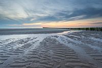 Zonsondergang op het strand van het Zeeuwse Domburg als het bijna laag water is. Op deze prachtige zomeravond zoekt het laatste water zich nog een weg naar zee voordat het tij weer zal keren.
