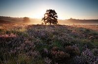 Sunrise behind the oak tree on the hills with the flowering heather. Posbank, Gelderland, the Netherlands
