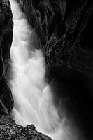 Zwart-witfoto van de stroming bij regenachtig weer in de Partnachklamm bij Garmisch-Partenkirchen