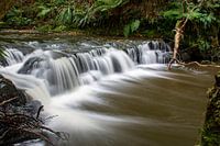 Stroomversnelling in een dicht bos. Natuur in Nieuw Zeeland. Water over de rotsen dat door een lange sluitertijd een bijzonder effect geeft.