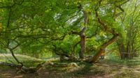 Grillige eikenbomen in dit bos, stammen en takken van deze eik groeien alle kanten op. Het is zomer, zonlicht valt mooi door de groene bladeren. Sfeervolle foto