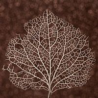 "Structuur in de natuur: De nervenstructuur van een hortensiablaadje" is een macrofoto van een hortensiablaadje wat bijna vergaan is. Bijna alleen de nervenstructuur is nog over en deze is al wat houtachtig geworden. Dit geeft een prachtig natuurlijk effect. De achtergrond heb ik op een speciale manier belicht waardoor er vage cirkelachtige patronen ontstaan in verschillende kleuren bruintinten. Omdat ik gekozen heb voor een geringe scherptediepte, kun je niet zien wat de achtergrond is, waardoor het een prachtige decoratieve functie krijgt. Dit zorgt ook voor diepte in het werk. Als je inzoomt op de foto kun je dit goed zien. Ook zie je dan goed hoe mooi scherp deze structuur is.