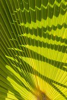 Close-up van de natuurlijke textuur van een palmblad gefotografeerd in halfschaduw. Deze foto richt zich op de radiale structuur van het blad en de schaduwen van een ander palmblad. Naar mijn mening zijn bladeren natuurlijke meesterwerken van design.