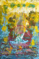 De krachtige combinatie van geel, blauw en rood geeft het schilderij energie en contrast. Tegelijk zorgen de lagen en structuren…