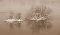 Struiken in bevroren hoog water wat zich tot kleine eilandjes deed vormen.
