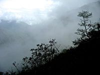 Op grote hoogte in de bergen van Peru langs het pad van de Inca's gras en struiken met op de achtergrond de Machu Picchu in de mist.