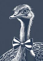 Een witte en donkerblauw-grijze illustratie van een struisvogel met een strik.