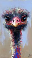 Een schetsachtige poster met een speelse struisvogel die nieuwsgierig zijn kop schuin houdt, getekend in dynamische, losse lijnen. De veren zijn kleurrijk en schematisch weergegeven, met een vrolijke mix van pastel- en felle tinten. Een oversized bril balanceert charmant op zijn snavel, terwijl de achtergrond een minimalistische…