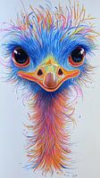 Een schetsachtige poster met een speelse struisvogel die nieuwsgierig zijn kop schuin houdt, getekend in dynamische, losse lijnen. De veren zijn kleurrijk en schematisch weergegeven, met een vrolijke mix van pastel- en felle tinten. Een oversized bril balanceert charmant op zijn snavel, terwijl de achtergrond een minimalistische…