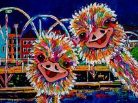 Kleurrijke struisvogels s'avonds in Willemstad, Curaçao van de kunstenaar Renate Rolefes.