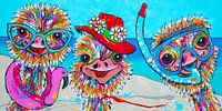Drie kleurrijke struisvogels op het strand van de kunstenaar Renate Rolefes.