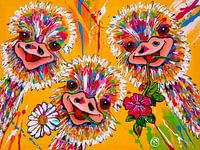 Struisvogels met bloemen in de bek op een gele achtergrond van de kunstenaar Renate Rolefes.