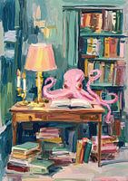 Dit impressionistische schilderij toont een roze octopus aan een houten bureau midden in een bibliotheek. De scène omvat een bureaulamp met een roze kap, brandende kaarsen en opengeslagen boeken, die een geconcentreerde sfeer creëren. Op de achtergrond is een kamerhoge boekenkast met kleurrijke boekruggen te zien tegen een blauwgroene…