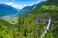 Stuibenfall waterval grootste waterval in Tirol in het Ötztal met de stad Umhausen op de achtergrond in Tirol Oostenrijk tijdens een mooie lentedag in de Alpen.