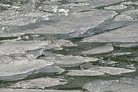 Grote platen ijs bewegen door de wind op het IJsselmeer en kruipen tegen de dijk op