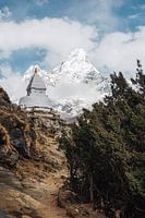 Een foto van de prachtige en indrukwekkende berg Ama Dablam in de Himalaya van Nepal. Op de voorgrond zie je een Tibetaanse stupa. Deze foto van de berg en de stupa is gemaakt tijdens de klimexpeditie van Ama Dablam.