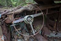 Sturen van auto's op autokerkhof in een bos in Ryd in Zweden. Verspreid over bos liggen autos uit de 40-er e50-er en 60-er jaren als oud schroot te vergaan.