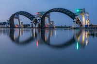 Stuw en sluizencomplex Amerongen tijdens de zomer maanden met geopende bogen. door de extreme regenval in Juli moeste de stuwen in de Lek geheel worden geopend. Tijdens het Blauwe (Blue Hour) uurtje.