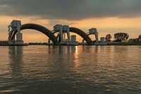 Stuw en sluizencomplex Amerongen tijdens de zomer maanden met geopende bogen. door de extreme regenval in Juli moeste de stuwen in de Lek geheel worden geopend. Tijdens het Gouden ( Golden Hour ) uurtje.