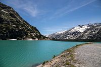 Gelmersee is een waterkrachtreservoir in Berner Oberland, Zwitserland. Super helder water. Contrast. De lange stuwdam is goed te zien op deze foto.