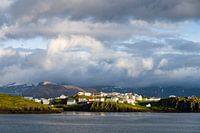 Aankomst in Stykkishólmur met de veerboot vanuit de Westfjorden levert dit uitzicht op. Stykkishólmur is verder geen mooie plaats, zoals zo vele IJslandse plaatsjes, maar vanaf het water in het avond zonlicht ziet het er heel aardig uit.