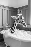 Deze unieke badkamermuurschildering toont een sublieme giraffe die ontspant in zijn bad en een heel speciaal tintje aan je badkamer geeft. De zwart-wit fotografie geeft de afbeelding een tijdloze elegantie en benadrukt de details van het tafereel, waardoor het een charmante en unieke toevoeging is aan je badkamerdecor. Perfect voor het verfraaien van je toilet of badkamer, het herinnert je eraan dat dieren ook momenten van rust en plezier kunnen ervaren. Deze moderne serie badkamerafbeeldingen biedt een onconventionele decoratie die zowel een glimlach op je gezicht tovert als je badkamer verfraait. Breng een sfeer van elegantie en gratie naar je toilet met dit fascinerende kunstwerk en laat je inspireren door zijn aanwezigheid.