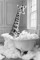 Deze unieke badkamermuurschildering toont een sublieme giraffe die ontspant in zijn bad en een heel speciaal tintje aan je badkamer geeft. De zwart-wit fotografie geeft de afbeelding een tijdloze elegantie en benadrukt de details van het tafereel, waardoor het een charmante en unieke toevoeging is aan je badkamerdecor. Perfect voor het…