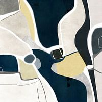 Abstracte geometrische compositie in beige, crème, donkerblauw en zwart. De kleuren zijn gedempt en creëren een kalme en serene sfeer. De algemene indruk wordt gekenmerkt door organische vormen en structuren.