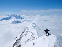 Een alpinist op een scherpe sneeuwgraat op de berg Denali, vroeger Mount McKinley genoemd. Dit is de hoogste berg van Noord Amerika en ligt in Alaska. Het beklimmen van deze berg vergt veel voorbereiding en training. De expeditie zelf duurt ongeveer drie tot vier weken. Het is een van de Seven Summit, de hoogste bergen op alle zeven continenten.