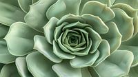 Met een diepe focus die de subtiele nuances van elke curve en vouw vastlegt, lijkt het alsof het beeld beweegt en ademt. De zachte, mintgroene kleur van de bladeren wordt versterkt door het diffuse licht, dat de textuur en de fluwelen zachtheid van de plant benadrukt. De compositie van dit kunstwerk is zowel rustgevend als intrigerend, met een natuurlijk ritme dat de kijker meeneemt op een visuele reis vanuit het centrum van de succulent naar buiten toe. De randen van de bladeren zijn subtiel omlijnd met een lichtere tint, wat bijdraagt aan het driedimensionale effect. Deze vetplant is gefotografeerd vanuit een perfecte hoek om de wiskundige precisie en natuurlijke schoonheid van zijn groeiwijze te vieren.