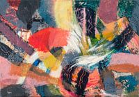 Modern abstract schilderij met veel kleuren, lagen en structuren.
