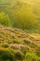 Net na zonsopkomst was het nog heerlijk rustig op de heide van het herikhuizerveld. De heide stond voor een deel in bloei maar was nog niet op het hoogtepunt. Toen de zon door de wolken brak gaf dit een heerlijke warme gloed over de heide in de voorgrond en het boompje met rode bessen werd warm gekleurd door de zon.