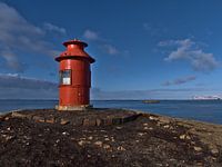 Zicht op de oranje vuurtoren Súgandisey op een klein eiland voor het vissersdorp Stykkishólmur aan de noordkust van Snæfellsnes in het westen van IJsland op een zonnige dag in de winter met ruige besneeuwde bergtoppen aan de kust.