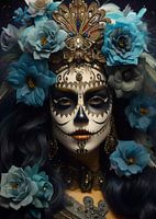 Suikerschedel dag van de doden portret van een mooie vrouw met grote blauwe bloemen om haar heen