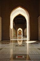 Interieur van de grote Sultan Qaboos Moskee in Muscat Oman. De spiegelingen op de gepolijste vloer en lichtinval geven een speciaal aspect aan dit beeld