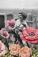 Samen vormen ze het vrolijke, zomerse, retro en ietwat onwaarschijnlijke portret van een vrouw op fiets, de stad ontvlucht en heuvelopwaarts gereden, de grote stad ontvlucht.