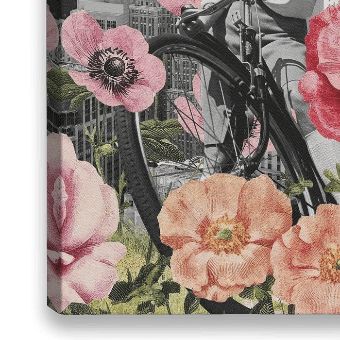 Samen vormen ze het vrolijke, zomerse, retro en ietwat onwaarschijnlijke portret van een vrouw op fiets, de stad ontvlucht en heuvelopwaarts gereden, de grote stad ontvlucht.