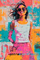 Een kunstwerk van een vrouw in een streetwear-fashion outfit tegen een abstracte achtergrond met levendige kleuren en texturen met dynamische paletmes streken. De afbeelding geeft een energieke vrolijke sfeer met een zomerse vibe.
