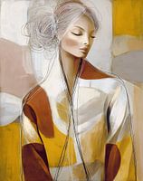 Abstract mixed media portret van een vrouw met verf en lijntekening elementen in voornamelijk geel, wit en bruin tinten.