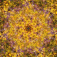 Kleurrijk, beweeglijk, caleidoscopisch beeld, gecreëerd door het kopiëren, roteren en overvloeien van een foto van kattenstaart en guldenroede in een tuin op een zonnige zomerdag.