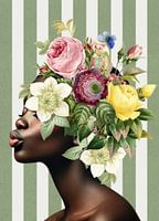 Een zomers, vrolijk en kleurrijk portret van een vrouw met een bijzonder kapsel vol met bloemen.