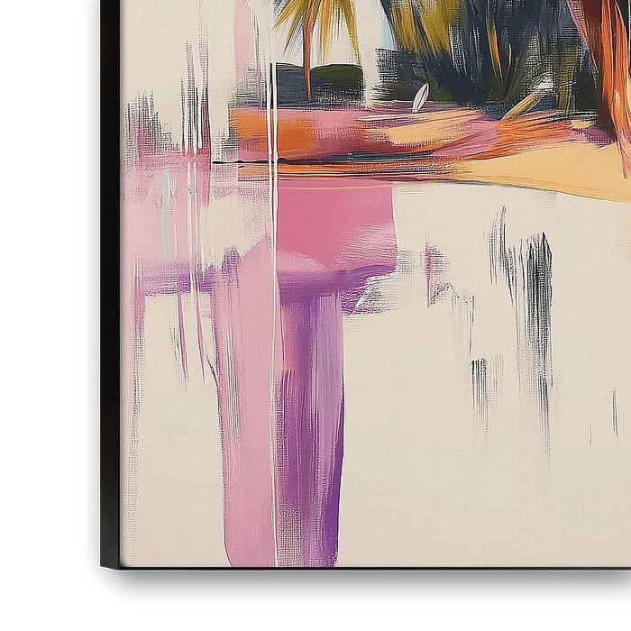 De compositie speelt met contrasten tussen scherpe paletmesstreken en zachte overgangen, waardoor de grens tussen figuur en achtergrond vervaagt. Achter de vrouw glanzen abstracte kleurvlakken in paars, roze, oranje en groen, met accenten van blauw, wit en bruin die diepte en ritme brengen. De kleuren dansen als lichtreflecties op water of het flikkeren van celluloid in oude filmbeelden.
