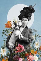 Een vrolijk, zomers en ietwat onwaarschijnlijk portret van een vrouw met haar hond in een tuin vol bloemen.