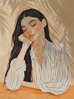 Portret van een vrouw, dagdromend in de warme zomerzon die op haar gezicht de schaduwen van planten werpt.