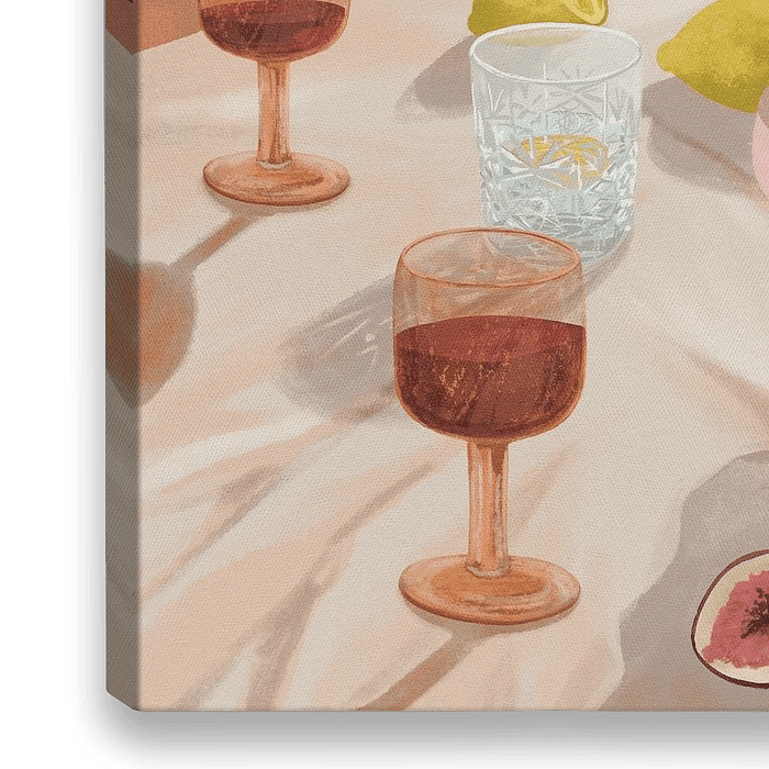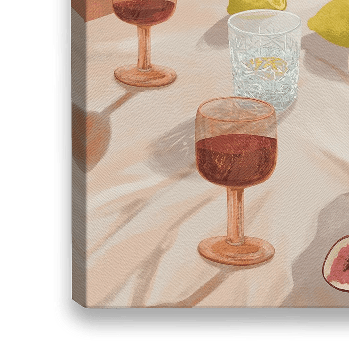 Heerlijke nazomersfeer in deze illustratie van een gedekte tafel met een vaas bloemen, wijnglazen, vijgen en citroenen. Hier is overduidelijk lekker getafeld en er zijn verhalen uitgewisseld tussen vrienden. Maar... wie doet de afwas?