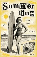 Deze vrolijke collage in retrostijl brengt de zonnige jaren '50 tot leven met een surfende pin-up, zeegezichten en grafische elementen. Een nostalgisch eerbetoon aan zomers vol zon, zee en strandplezier.