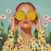 Mix van illustratie en schilderij. Een zomers tafereel. Een visie op de zomer. De brilleglazen zijn geel als de kleur van de zon. Ook de blouse heeft dezelfde zonnig kleur. Op haar blouse diverse zomerse bloemen net als in het bloemenveld achterhaar. Bloemen in roze, wit, rood. Blauwe achtergrond. Vrolijk en pastel. Zomer. Lente. Bloemenveld.